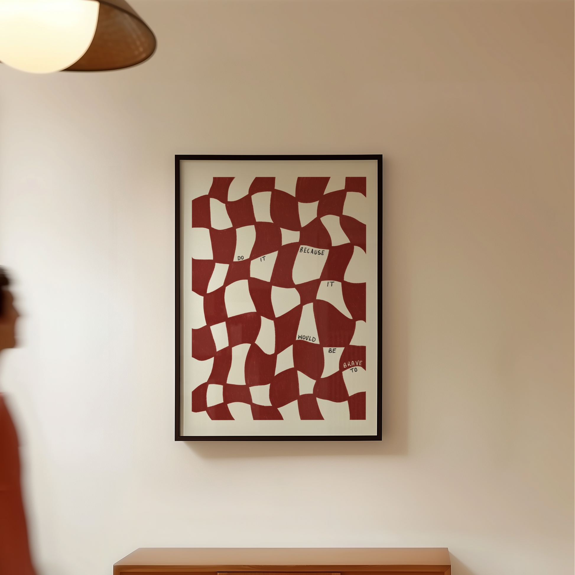 Do It Because It Would Be Brave To Burgundy Red and Ivory Wavy Checkered Typography Print